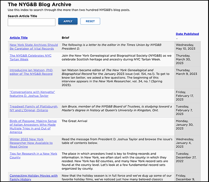 Run since the launch of newyorkfamilyhistory.org, the NYG&B blog has now published over two hundred posts, covering the latest genealogical news, as well as colorful stories on family history, tips on approaching research, and so much more.