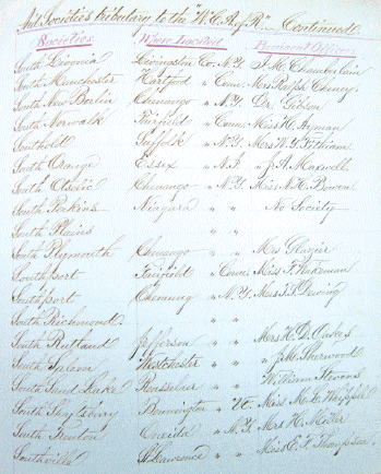 Women’s auxiliary records in the collection are organized by their committee-based working structure and/or by a geographical arrangement. By 1864, NEWAA, WCAR, and the Women’s Pennsylvania Branch established a county-based associate manager system to streamline their work processes. They used a geographical structure (state, county, locale) to organize information, and kept various indices to identify their main contacts in particular places, both for correspondence and supply purposes. Collection guides identify the variety of records kept and point the researcher to any index tools found within, or in other record groups.